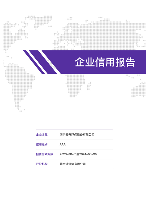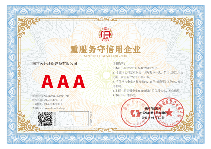 南京云升環保設備有限公司全體員工愿以環境保護為己任,以市場為導向,以優質服務為原則,嚴格的管理、先進的生產工藝、至上的品質、完善的售前售后服務,與廣大新老用戶攜手并進,共鑄輝煌。公司已通過ISO9001:2000質量管理體系標準認證,成為江蘇省高新企業,并進行不斷的技術改進和創新,為客戶和合作伙伴提供滿意的產品。